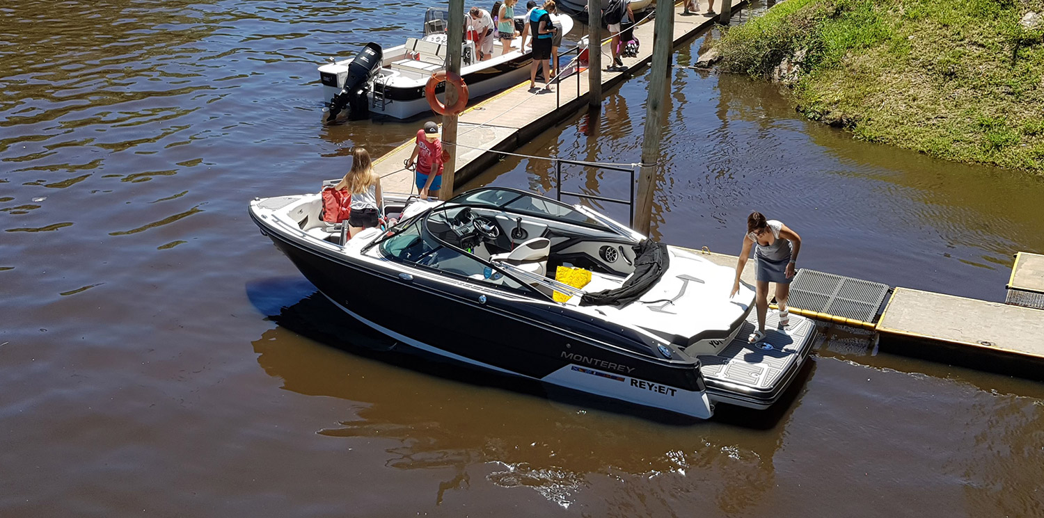 Marinas de embarque y desembarque, con pontones de hormigón alivianado, muy estables y seguras y recubiertos sus bordes con ¨botazos¨ de pvc para el cuidado de su embarcación.