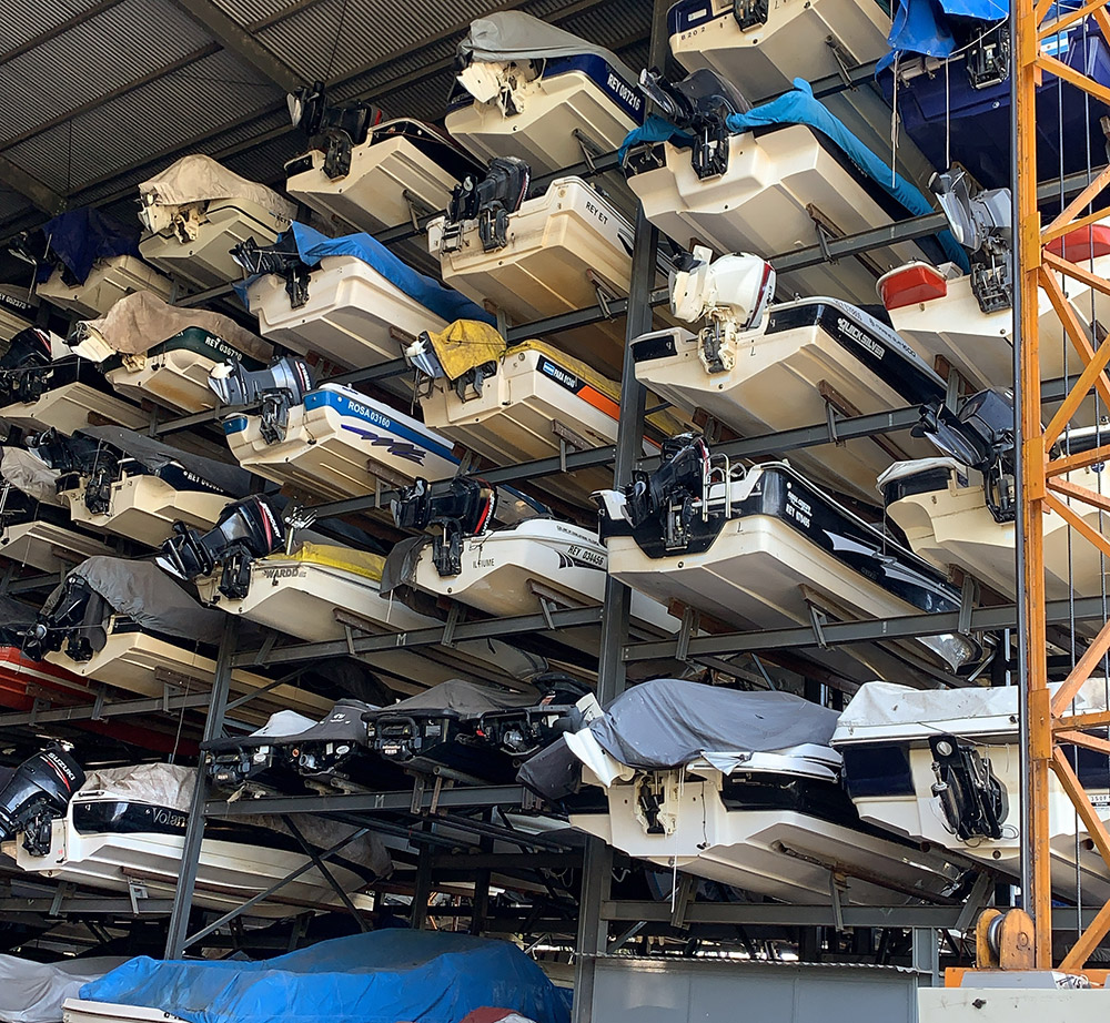 Encontrarás 2 naves con 400 lanchas de capacidad, con modernos, seguros y eficientes sistemas de movimientos, con puente grúa y elevadores de costa de hasta 3 ton de capacidad, tanto para botar e izar las embarcaciones al regreso.